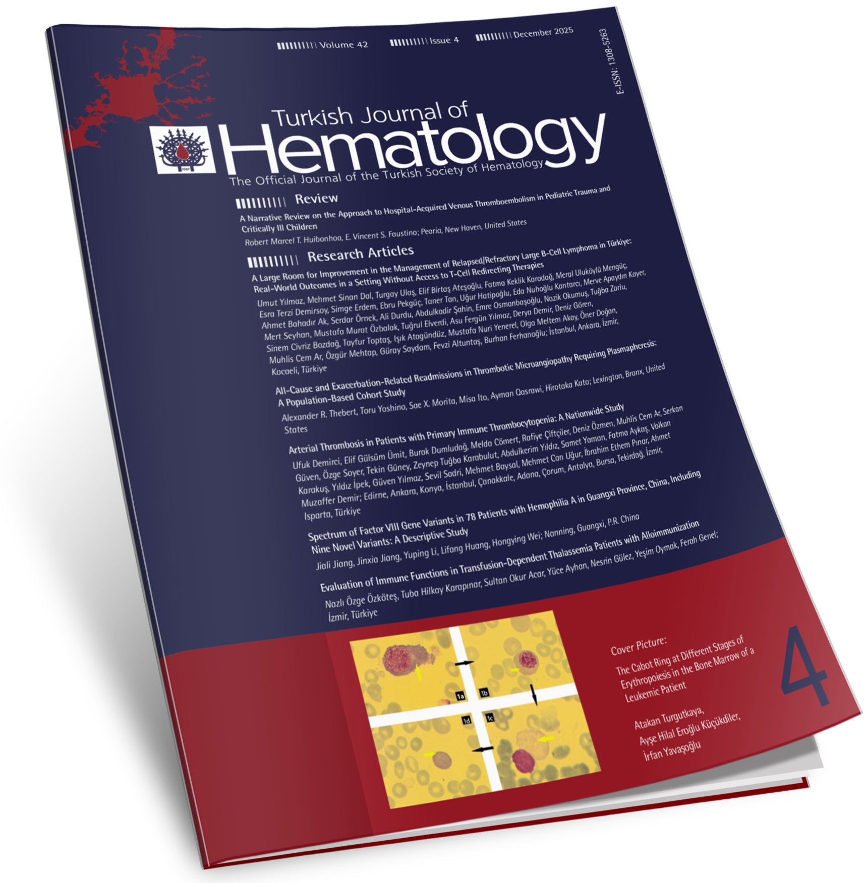 | 6. | Evaluation of Immune Functions in Transfusion-Dependent Thalassemia Patients with Alloimmunization Nazli Özge Özköteş, Tuba Hilkay Karapınar, Sultan Okur Acar, Yüce Ayhan, Nesrin Gülez, Yeşim Oymak, Ferah Genel doi: 10.4274/tjh.galenos.2025.2025.0106 Pages 306 - 314